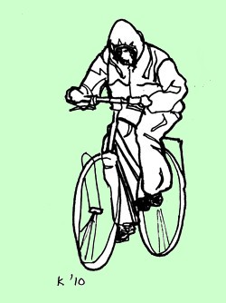 Ons weer is van dien aard dat er op het gebied van regenkleding een schat aan adequate én aantrekkelijke producten zou moeten bestaan, om de fietser en de wandelaar droog te houden; niets is echter minder waar. Je kunt eigenlijk alleen kiezen uit het regenpak, de regenjas en de regencape. Pakken, jassen en capes hebben allemaal hetzelfde model en qua kleur is er ook niet veel variatie. Allemaal zijn ze in hoge mate onelegant. ‘Functie baart vorm,’ is hier blijkbaar helemaal niet van toepassing. Een kennis van mij is op het idee gekomen om regenkleding op de markt te brengen die ontworpen is door een echte modeontwerpster. Het resultaat was: interessante modellen, maar niet meer dan twee en wat onhandige beenstukken, en bijzonder pittig geprijsd. Dat biedt vooralsnog geen soelaas, maar het kan dus wel.