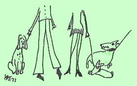 Verder de straat overstekend kwamen we maar liefst vijf personen tegen met een keurig aangelijnde hond plus plastic zakje, eveneens bezig met de onmisbare avondwandeling. Een praatje met zo’n hondeneigenaar kan leerzaam of prettig zijn maar dat is geheel afhankelijk van de respectievelijke honden. Mogen ze elkaar niet dan kun je je maar het best snel uit de voeten maken voordat het geblaf de buurt wakker maakt.