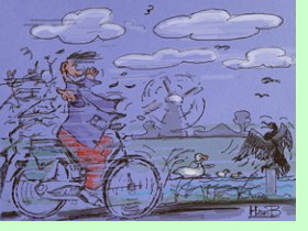 Als ik onder de spoorbrug vandaan kom priemt mijn voorwiel recht het Groene Hart in. Het is hier weids, groen en plat. Het zicht op de horizon wordt enkel verstoord door hier en daar een vage kerktoren en snel draaiende wieken van molens. Het kaarsrechte fietspad naast de N401 nodigt uit tot tempo. De bolle oostenwind slaat het asfalt nog vlakker en jaagt mijn trapcadans op. Ik suis Portengen en Kockengen voorbij, ik hou van mijn land, mijn vlakke land *.
