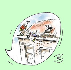 De bomen op ons Dorpsplein in Zeeland worden ieder jaar weer groter. Prachtig. Dat wel. Maar in de herfst komen er dus ieder jaar weer meer afgevallen bladeren in onze dakgoot terecht. En het is een heel karwei om ze daar weer uit te krijgen voordat al dat blad de regenpijp naar beneden verstopt. Ieder jaar zie ik daar meer tegenop. Met een wankele ladder naar boven. Dan balanceren op de goot en tegelijkertijd de bladeren voor je uit en naar beneden vegen. Ieder jaar duurt het langer voordat ik me daartoe kan zetten. Al was het alleen maar omdat ik ieder jaar weer een jaartje ouder word en steeds wat minder kan. Dit jaar duurde het wel erg lang. Tot mevrouw Pasgeld tenslotte vroeg of het niet eens tijd werd de bladeren uit de goot te vegen. ‘Ik durf eigenlijk niet zo goed meer’, bekende ik. ‘Nou, dan help ik je toch’, bood ze goedhartig aan.