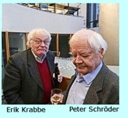 Misschien is ons samenzijn op school wel de kern van onze verhouding. Hij en ik en Erik Krabbe wandelden graag ‘s avonds laat over het strand en onder het verlaten licht van de sterren ontdekten wij dat wij drieën niet zo lawaaierig waren als de meeste andere jongens van onze klas. ‘Wij zijn de kalme drie’ zei Peter. Ja zei Erik Krabbe, ‘wij zijn de Kalme Drie’. Wij lachten. Je ziet hier rechts op de foto Peter samen met Erik Krabbe, de filosofieprofessor, op mijn tachtigste verjaardag, een jaar terug. Vooral Erik en ‘Schreud’ zijn samen tot op het laatst hecht bevriend gebleven, hoewel Erik in Groningen woont. Schreud en Erik en ik, Kalme Drie, zijn uit het zelfde jaar 1943.