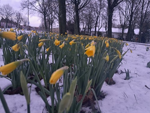 Wat ik wel zie, zijn Narcissen (Narcissus). In Amsterdam Noord, waar ik woon, vlak bij het Floradorp, zijn het de stevige narcisstengels, die al in december de grond doorboren. Vóór de jaarwisseling zag ik zelfs al bloemknoppen zitten. Efficiënt opgerold, schemerden de bloemblaadjes lichtgeel in hun inpakvliesjes. Nu, medio januari, zijn de meeste knoppen uitgepakt. De paasgele kelkbladeren omlijsten het hart van de plant: de oranje trompetters. Als een kwebbelende groep pinguins staan ze in de sneeuw. Kopjes naar beneden, de bloemen halfgesloten. Ze zijn nog niet helemaal wakker. “Hé wat leuk. Ben jij er ook weer? En weer wat kleintjes erbij? Gezellig”.
