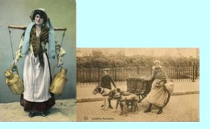 Vroeger waren er niet alleen charmante melkmeisjes die te voet ons melk brachten, er waren ook melkmeisjes en melkboeren die gebruik maakten van een kar, een kar getrokken door een hond, of meer honden, zoals op postkaart 1.b. Hier is een Vlaamse melkmeid te zien met haar broertje bij een kar getrokken door 3 gemuilkorfde honden, zo te zien geen gezellige viervoeters. De beste mensenvriend als trekdier, op de braderie zou het een afdeling treurige trekdieren rechtvaardigen. Ooit een echte hondenkar gezien? In Nederland werden ze vanaf 1963, na jarenlange actie van de Dierenbescherming bij wet verboden. Zouden er ergens in Brabant nog illegale hondenkarraces gehouden worden? Met astronomisch prijzengeld? Misschien is er nog wel ontheffing van het verbod mogelijk, voor demonstraties op een braderie!